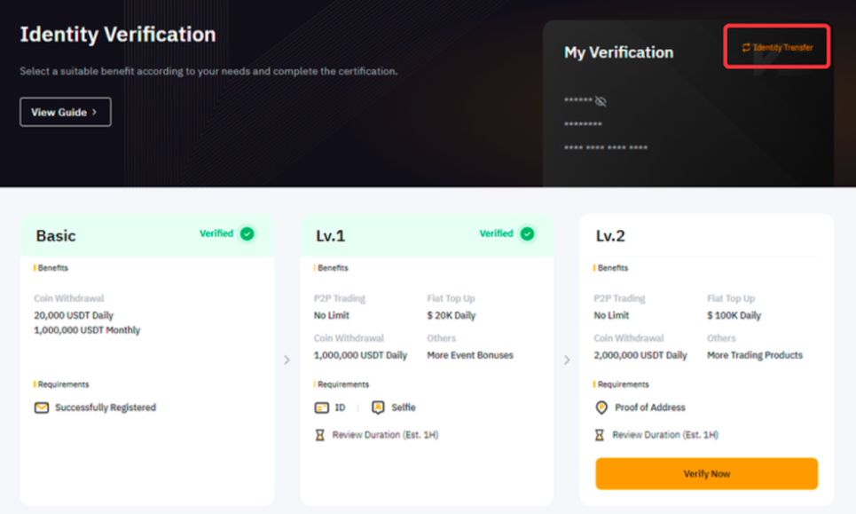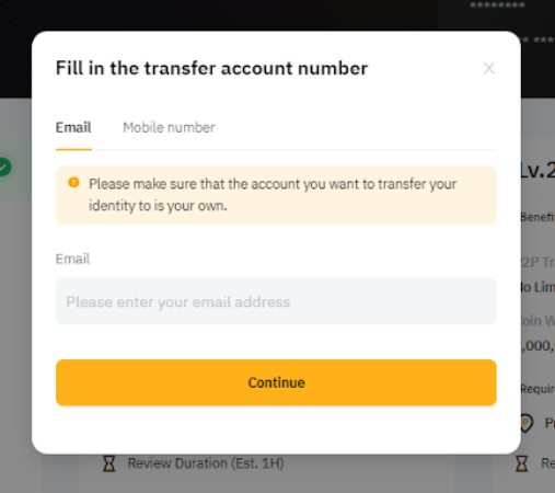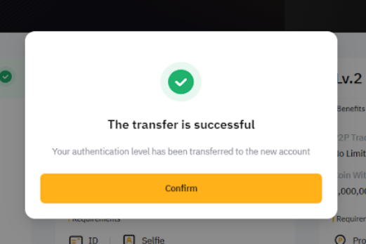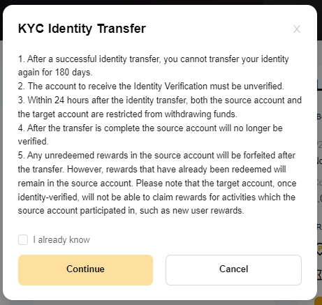 기존 계정 및 대상 계정은 신원 이전 후, 24시간 동안 출금 및 자산 거래가 불가능합니다.