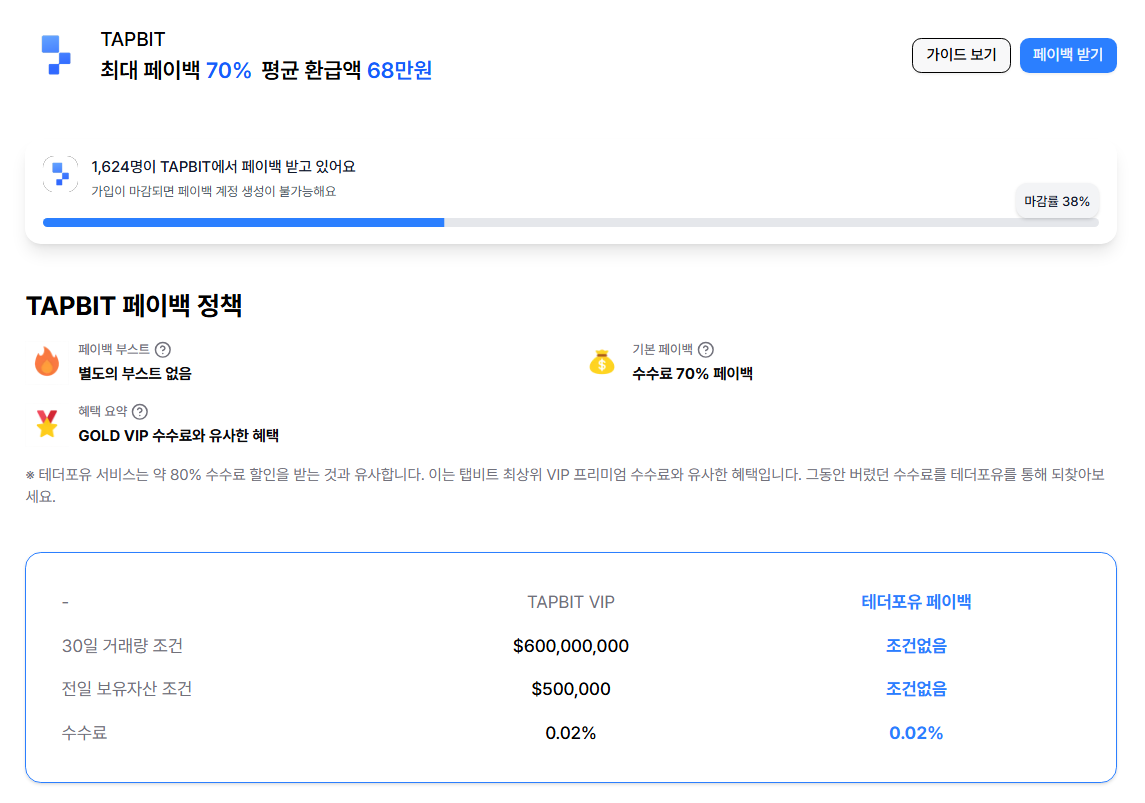 테더포유는 Tapbit 거래 수수료의 최대 70%을 제공하고 있어요.