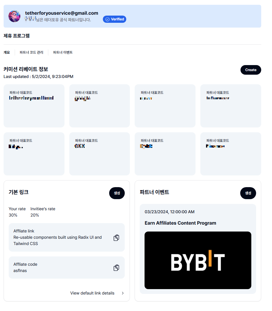 하지만, 테더포유 파트너가 된다면 거래소마다 가입할 필요 없이 테더포유 자체 파트너 페이지를 발급 받을 수 있으며,