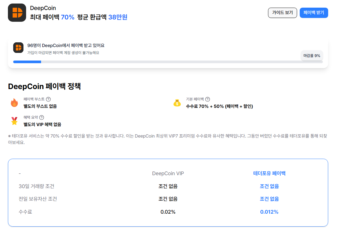 테더포유에서는 DeepCoin 수수료 70% + 50% (페이백 + 할인) 서비스를 제공하고 있어요.