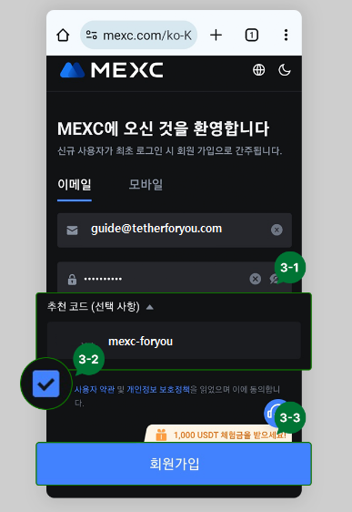 레퍼럴 코드에 mexc-tetherforyou가 보이지 않으신다면, 1번으로 돌아가 다시 한번 가입을 진행해 주세요.