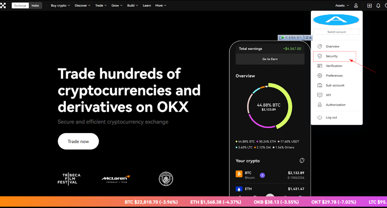 기존계정에 로그인 한 뒤 PC 버전 기준으로, OKX 홈화면에서 프로필 모양 클릭 후 [Security] 를 클릭합니다.