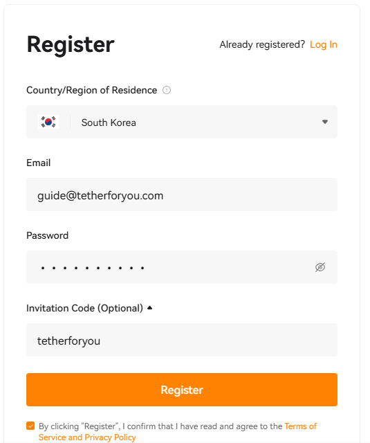 클릭 또는 테더포유 홈페이지를 통해 OrangeX 가입 링크로 접속해 주세요.